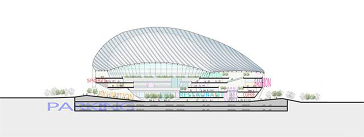 我們的靈感來(lái)源于體育場(chǎng)館建筑原型,意圖用超級(jí)碗的建筑形式來(lái)解決商業(yè)綜合體面臨的諸多城市問題。