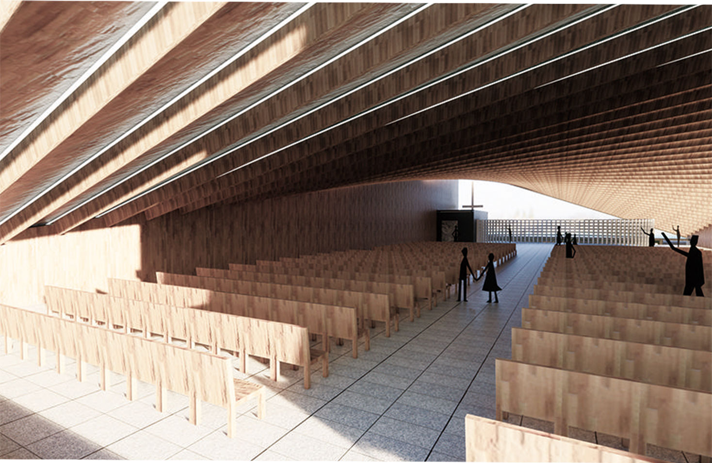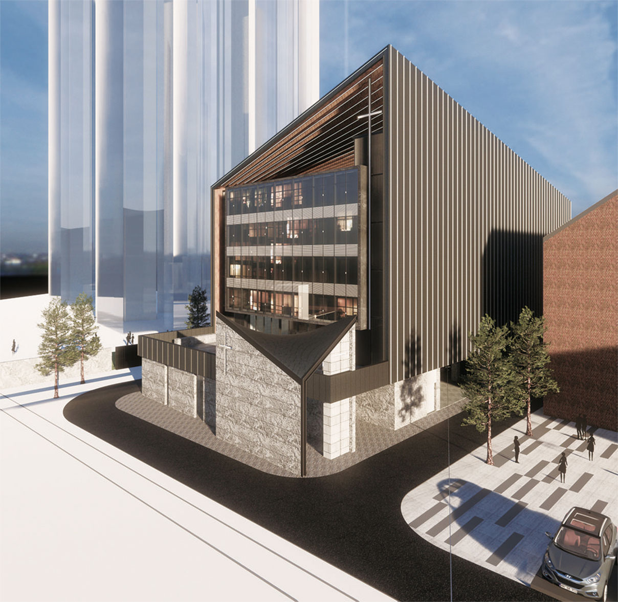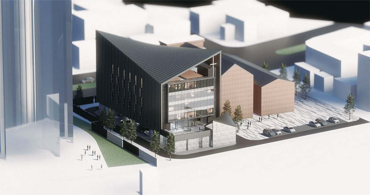 該項(xiàng)目位于福州市臺(tái)江區(qū),毗鄰保留建筑(江濱西大道285號(hào)),閩江沿岸,由于地塊狹長(zhǎng),教堂平面采用了簡(jiǎn)單的矩形,既符合教堂的使用功能,又協(xié)調(diào)了周邊的場(chǎng)地;建筑體量上簡(jiǎn)潔明朗,最大的特點(diǎn)是使用了雙曲面的金屬屋頂, 它讓人感受到了鳥(niǎo)的輕盈和它翱翔時(shí)翅膀的張力,夸張的曲線造型,象征著向天空展開(kāi)的張力,使教堂的辨識(shí)度大大增加, 單坡的雙曲面屋頂和旁邊的保留建筑屋頂協(xié)調(diào)統(tǒng)一,豐富了沿道路和沿江的城市天際線,建成后將可成為區(qū)域的地標(biāo)性建筑。