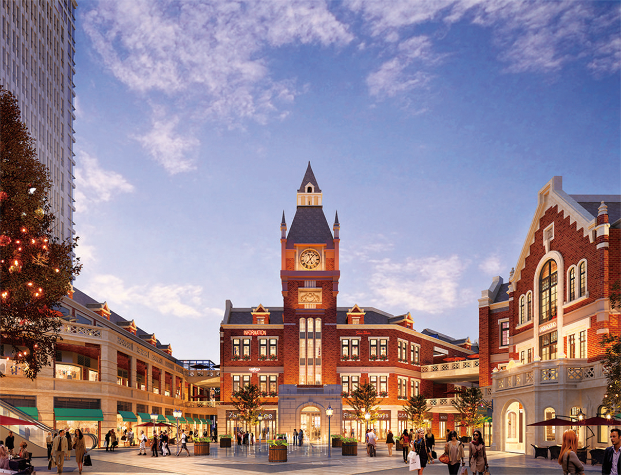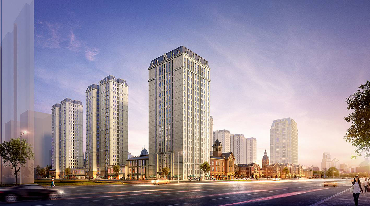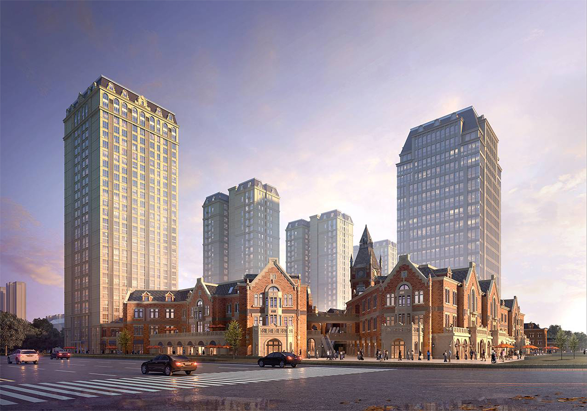 本項(xiàng)目的設(shè)計(jì)不僅關(guān)注構(gòu)建建筑,更注重于營(yíng)造空間,打造體驗(yàn)。設(shè)計(jì)師通過(guò)營(yíng)造引人矚目、優(yōu)雅浪漫的步行街道空間來(lái)豐富人們的商業(yè)體驗(yàn)。同時(shí),設(shè)計(jì)師賦予了建筑歷史厚重感,恰如其分地將歐式風(fēng)格與商業(yè)氛圍融合在一起。商業(yè)部分以優(yōu)雅、浪漫為主要基調(diào),采用了段落式重復(fù)狀的開(kāi)窗形式以及局部色彩小面積變化的表現(xiàn)方式;裝飾采用的是顏色莊重大氣的石材或仿古石材裝飾面;細(xì)節(jié)處理部分運(yùn)用柱廊、雕花、線條、鐵藝等形式,呈現(xiàn)出浪漫典雅的風(fēng)格,追求建筑的詩(shī)意;屋頂部分則采用坡度且有轉(zhuǎn)折的屋頂形式,意在打造一個(gè)具有歐式風(fēng)情街區(qū)的建筑形象。
