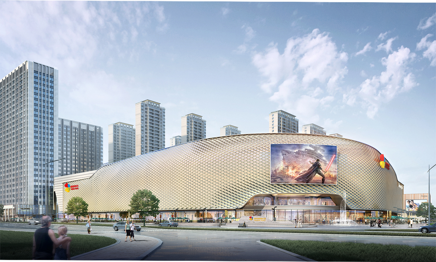 這是一個大型多功能、整體開發(fā)的區(qū)域綜合體項目。此項目的重點是塑造一個多功能混合的商業(yè)綜合體,使其成為該地區(qū)的活力聚合中心,同時也是一個城市形象的代表。項目處于城市的兩條主要道路之間。設(shè)計師對于這兩個邊界形象的定位是透明并且開放。尤其是面對主道的立面部分,設(shè)計師采用了參數(shù)化設(shè)計,形成虛實對比的效果,并且在保證視覺效果的同時也不忘實用功能。