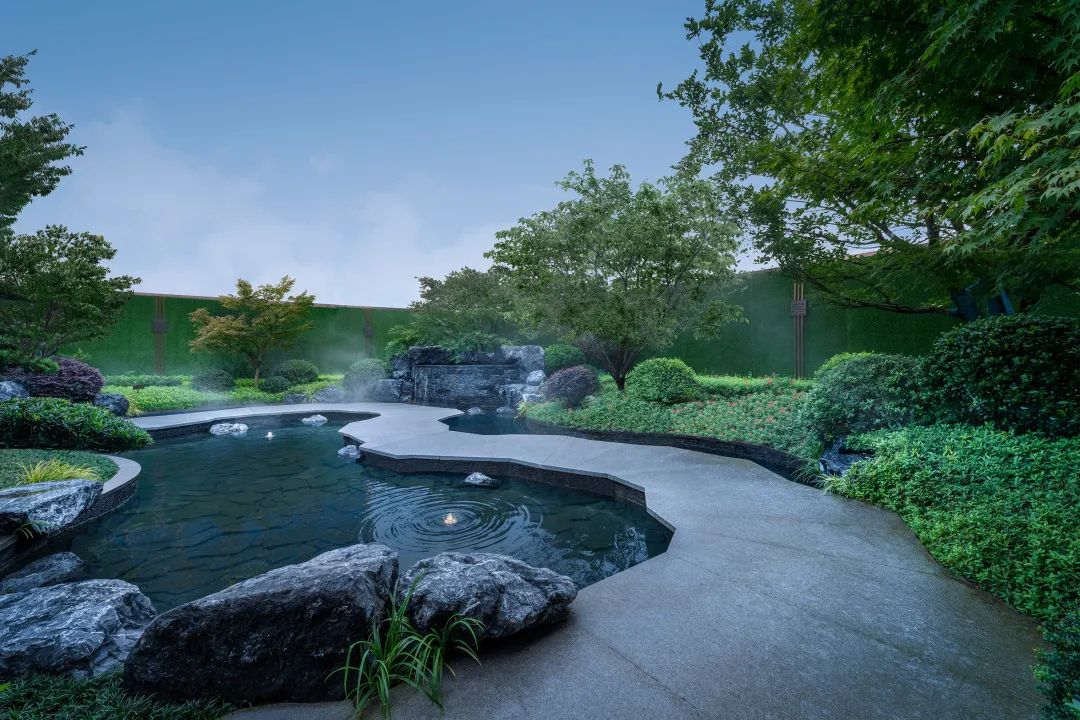 穿過售樓處建筑,豁然開朗,整個(gè)后場(chǎng)營(yíng)造了一個(gè)極為簡(jiǎn)潔純粹的空間,隨著晨昏的時(shí)間變化,交織的光影在景亭和水面上作畫,只為營(yíng)造純粹的東方美學(xué)意境,整個(gè)庭院猶如一幅持續(xù)變化著的山水畫卷。