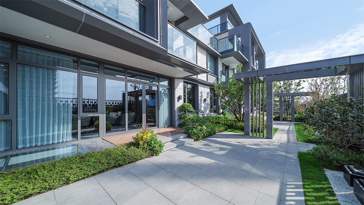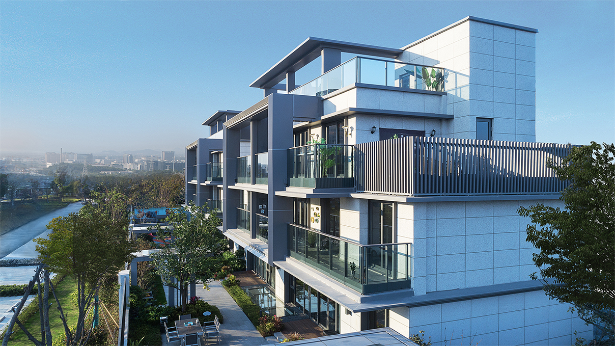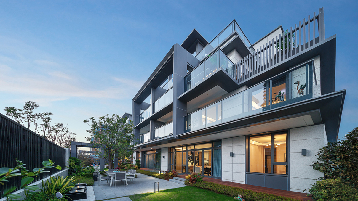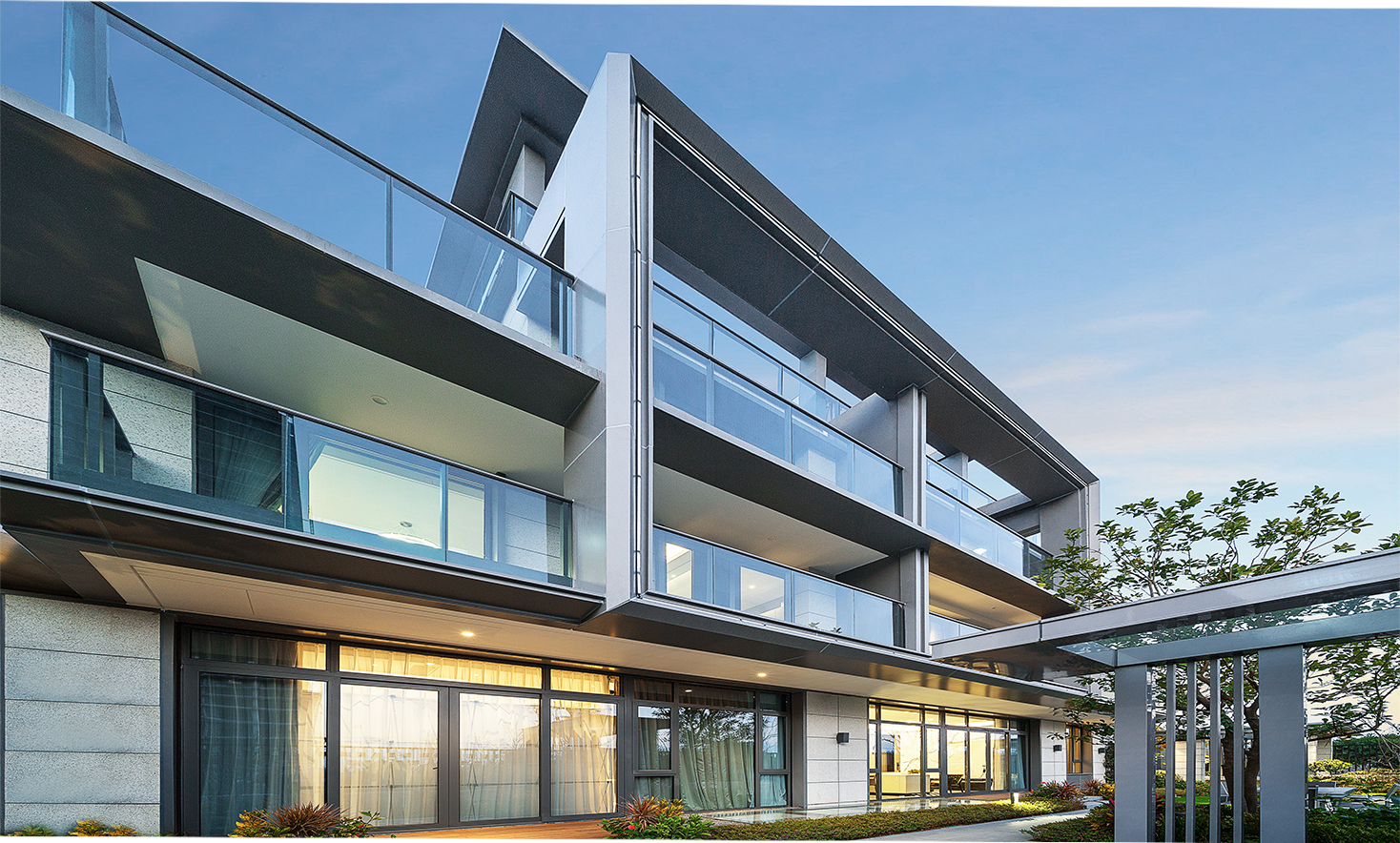 東方禪意與西方現(xiàn)代建筑對理性簡約美的崇尚,在審美價值觀層面水乳交融,形成了獨特的現(xiàn)代典雅建筑風格?,F(xiàn)代典雅住宅建筑端莊大氣,設計圍繞“純凈簡潔、輕盈飄逸”的理念,減少材料的種類,弱化了構件的厚度,突顯形體的輕盈挺拔。每個形態(tài)單元的構圖關系因此簡化為白色墻面與玻璃之間大實大虛的鮮明對比。為塑造形體輪廓的輕盈挺拔,建筑立面主要的豎線條,均做內(nèi)收三角形斜切處理,并以鋁型材收邊。不同材質(zhì)的精美交接,使形體轉折更加明確,賦予建筑冷峻的骨感美。