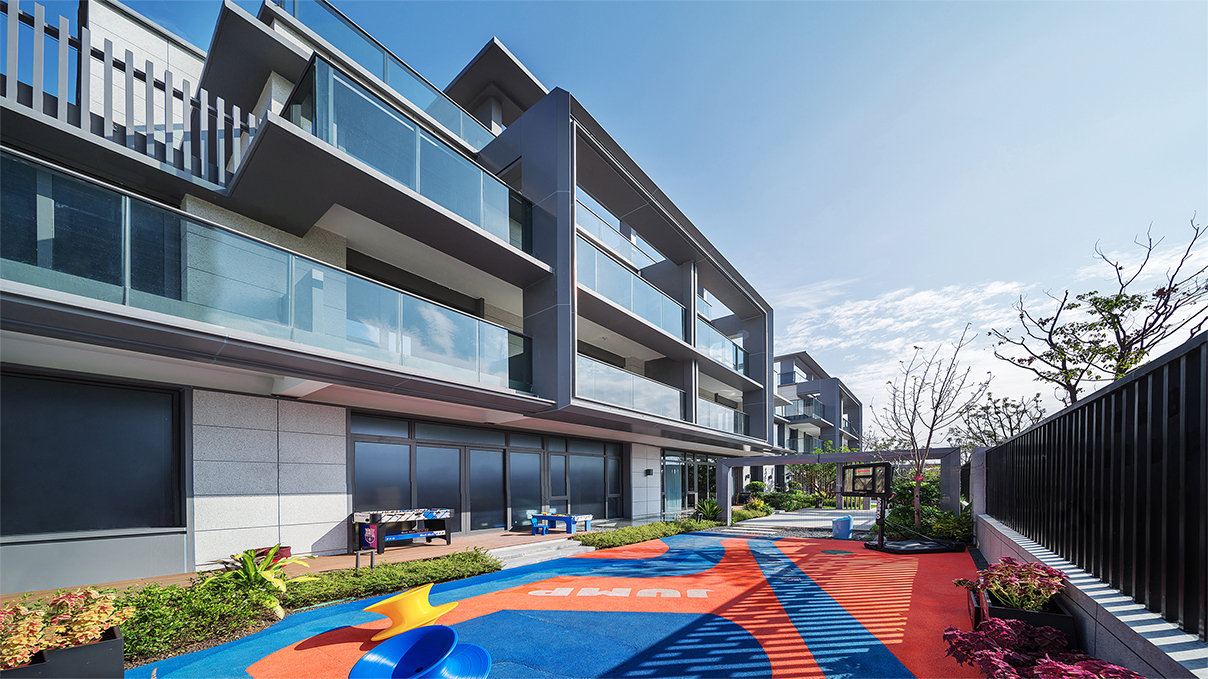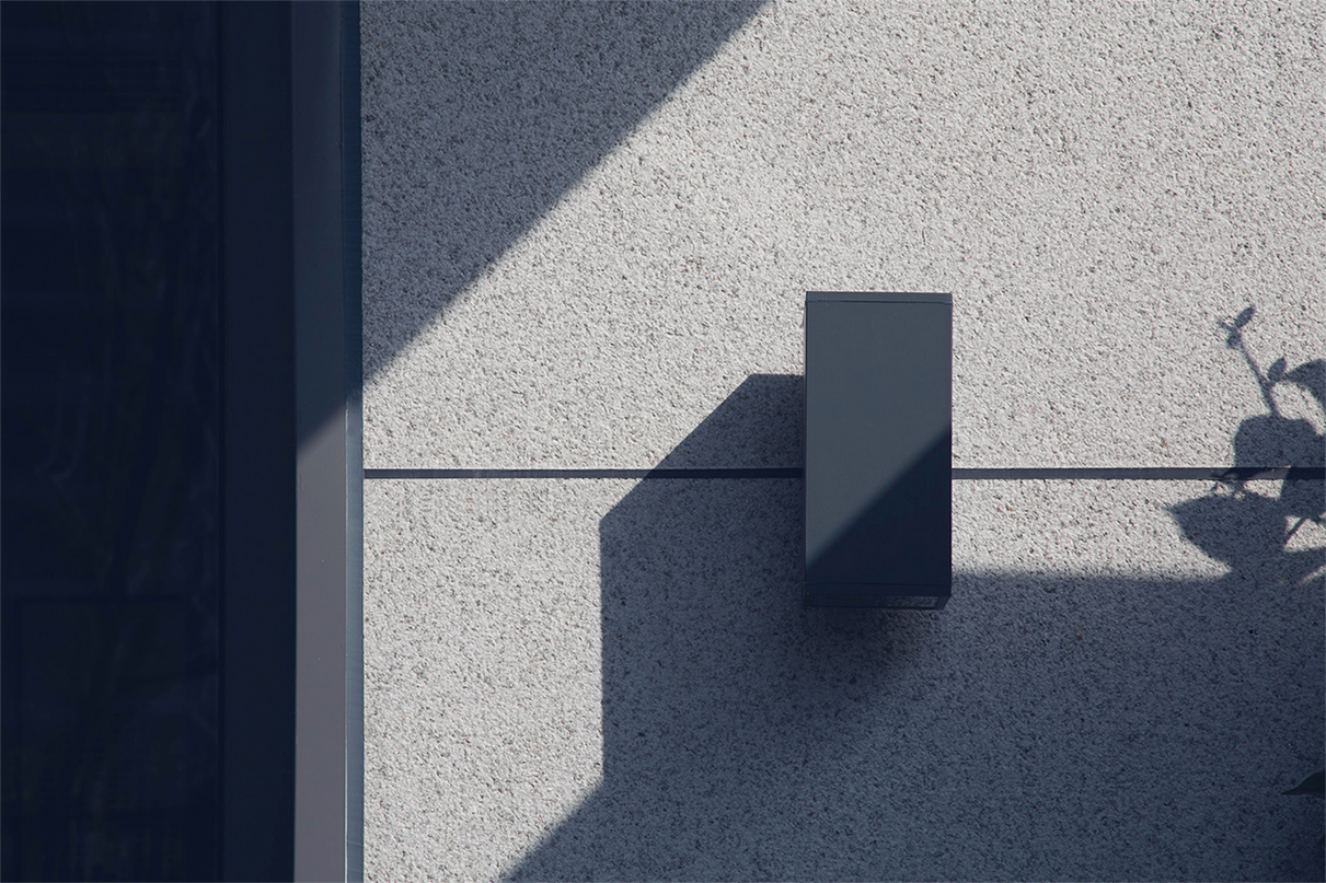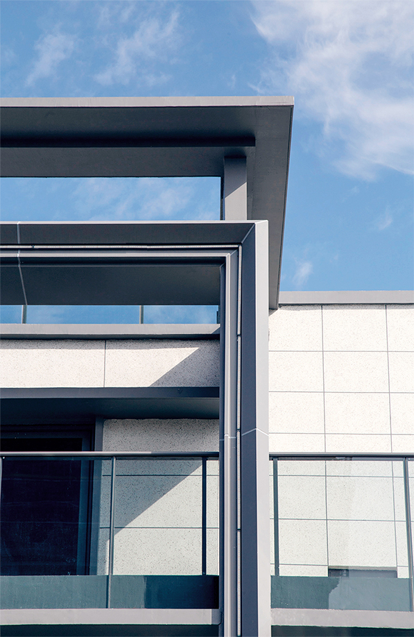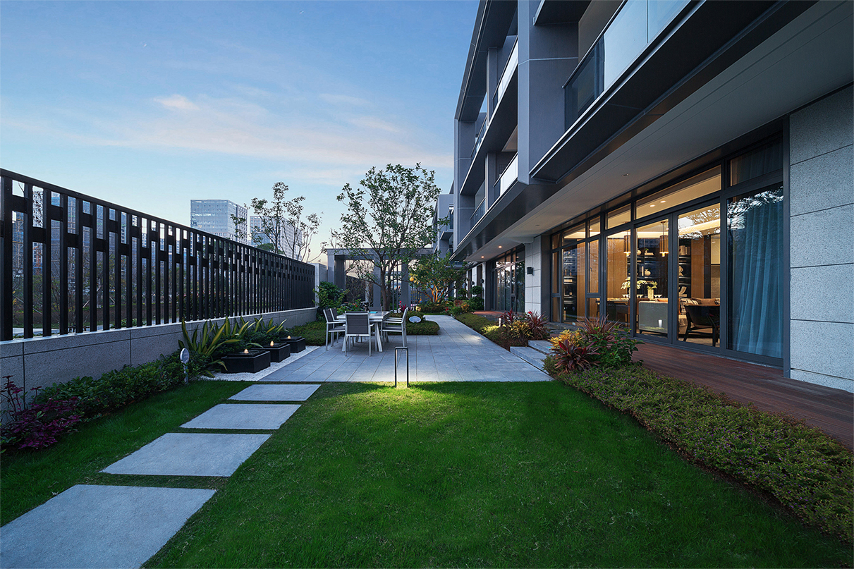 東方禪意與西方現(xiàn)代建筑對理性簡約美的崇尚,在審美價值觀層面水乳交融,形成了獨特的現(xiàn)代典雅建筑風格?,F(xiàn)代典雅住宅建筑端莊大氣,設計圍繞“純凈簡潔、輕盈飄逸”的理念,減少材料的種類,弱化了構件的厚度,突顯形體的輕盈挺拔。每個形態(tài)單元的構圖關系因此簡化為白色墻面與玻璃之間大實大虛的鮮明對比。為塑造形體輪廓的輕盈挺拔,建筑立面主要的豎線條,均做內(nèi)收三角形斜切處理,并以鋁型材收邊。不同材質(zhì)的精美交接,使形體轉折更加明確,賦予建筑冷峻的骨感美。