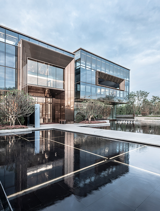 建筑的二層體量作為一個(gè)整體坐落于一層體量之上,首層采用具有高透性的超白玻,使二層體量遠(yuǎn)遠(yuǎn)望去仿佛懸浮于城市中的玻璃盒子。同時(shí)首層后退引入鏡面水景觀,首層采用的玻璃材質(zhì)使建筑與水景融為一體;沿主入口方向,由香檳色鋼板材質(zhì)包裹的主入口門頭符合訪客尺度,成為建筑亮點(diǎn)的同時(shí),還增加了引導(dǎo)性;建筑首層與二層的相互疊合,一氣呵成,形成有著多重感官體驗(yàn)的城市空間。