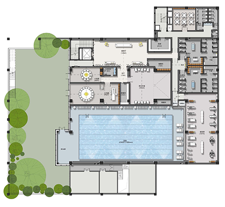 地下一層設(shè)施宴會(huì)廳及泳池,健身設(shè)施等,可以用來滿足不同訪客的需求,其次設(shè)置內(nèi)庭院與之相接,供訪客休憩,私密性好,有悠然自得之感。