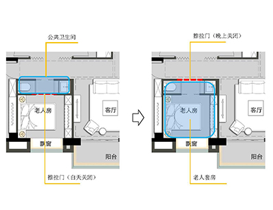 內(nèi)外兩道推拉門控制衛(wèi)生間的可分可合,白天作為公共衛(wèi)生間、晚上組合成老人套房。