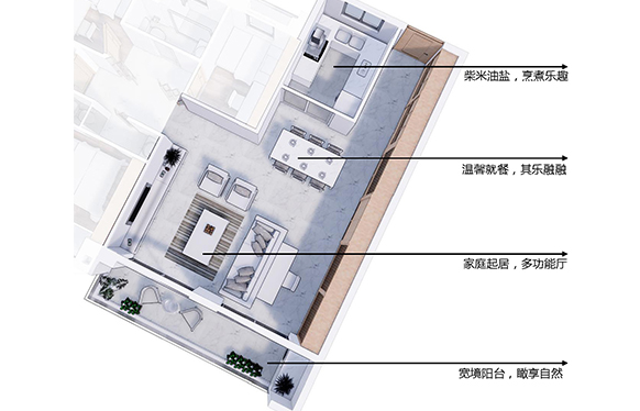開敞廚房、中西就餐區(qū)、多功能寬廳、全景陽臺,面積近60平方米!形成了整個生活的核心空間!聚會、交流、活動等,任你選擇創(chuàng)造。