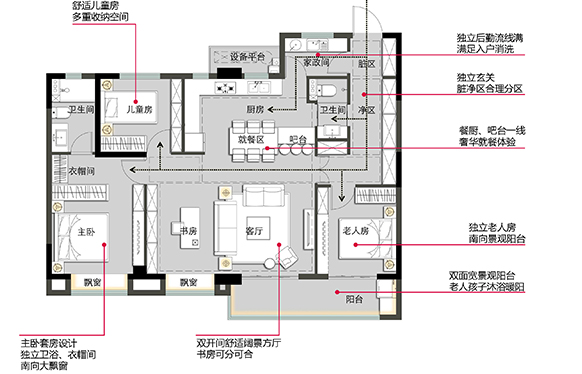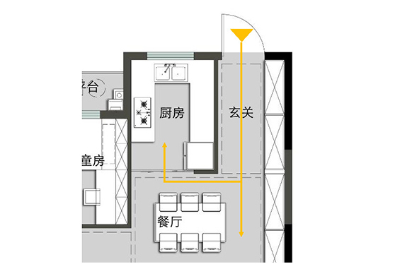 該洄游將入戶分為“家政動線”與“居家動線”。“家政動線”:玄關-家政間-廚房-餐客廳 動線,當買菜回家,或手上有重物回家時,先步入家政間處理,不必經(jīng)過客廳、餐廳,避免傳統(tǒng)戶型中,入戶動線不分離帶來的污漬、污染等情況。 “居家動線”:玄關-過廳-餐客廳等,讓家人或訪客直接通過玄關進入客廳等空間,相較于傳統(tǒng)入戶動線,避免與家政動線的重合,保證生活的干凈與從容。