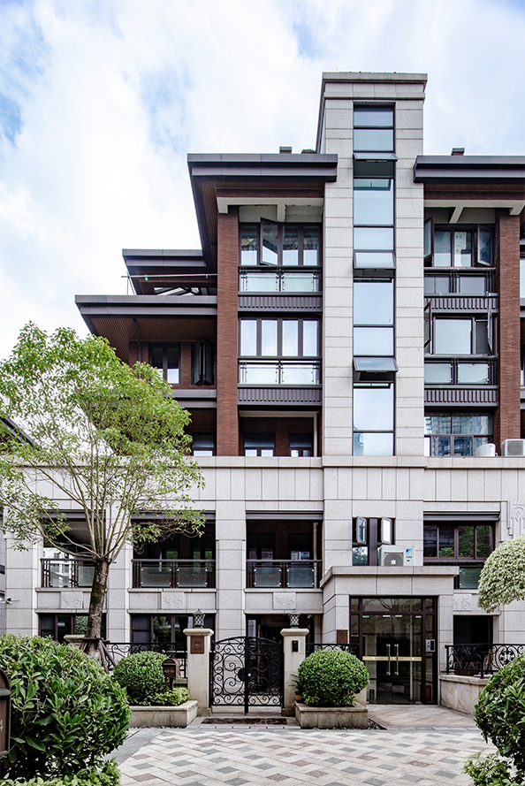 別墅區(qū)外立面選用"賴特草原風(fēng)格",厚重的石材基座、磚紅色條磚、大尺度外挑的四坡頂均是風(fēng)格重要的建筑語言??紤]到項(xiàng)目都市核心區(qū)域,立面設(shè)計(jì)中在風(fēng)格基礎(chǔ)上多增加了建筑細(xì)部的處理,檐口的細(xì)部、檐底的木飾面、基座的石材細(xì)節(jié),讓"草原風(fēng)格"別墅狂野的個(gè)性有所收斂。